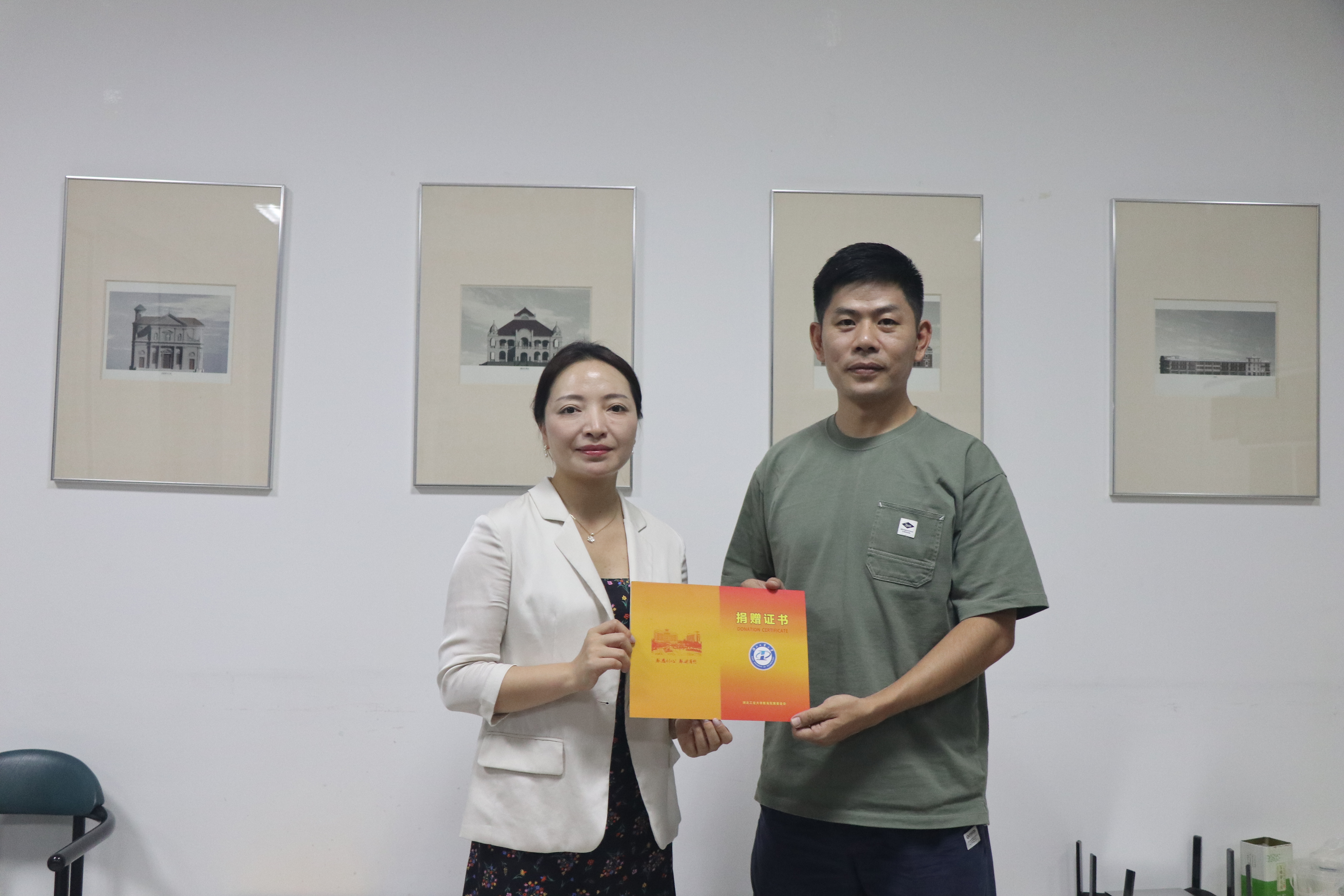 舒蕾代表学院接受捐赠,并颁发了捐赠证书。
